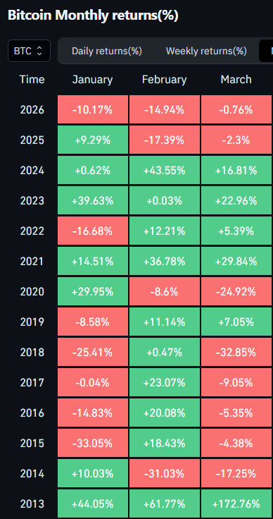 Coin Bureau melaporkan bahwa Bitcoin berpotensi mencatat triple red start pertama sepanjang sejarahnya di tahun 2026. Januari turun -10.17%, Februari -14.94%, dan Maret -0.76% semuanya merah. Akibatnya, Q1 2026 turun total -24.16%, menjadikannya kuartal ketiga terburuk sepanjang sejarah Bitcoin.Data dari CoinGlass menunjukkan ini adalah kejadian yang belum pernah terjadi sebelumnya untuk tiga bulan pertama tahun berjalan.