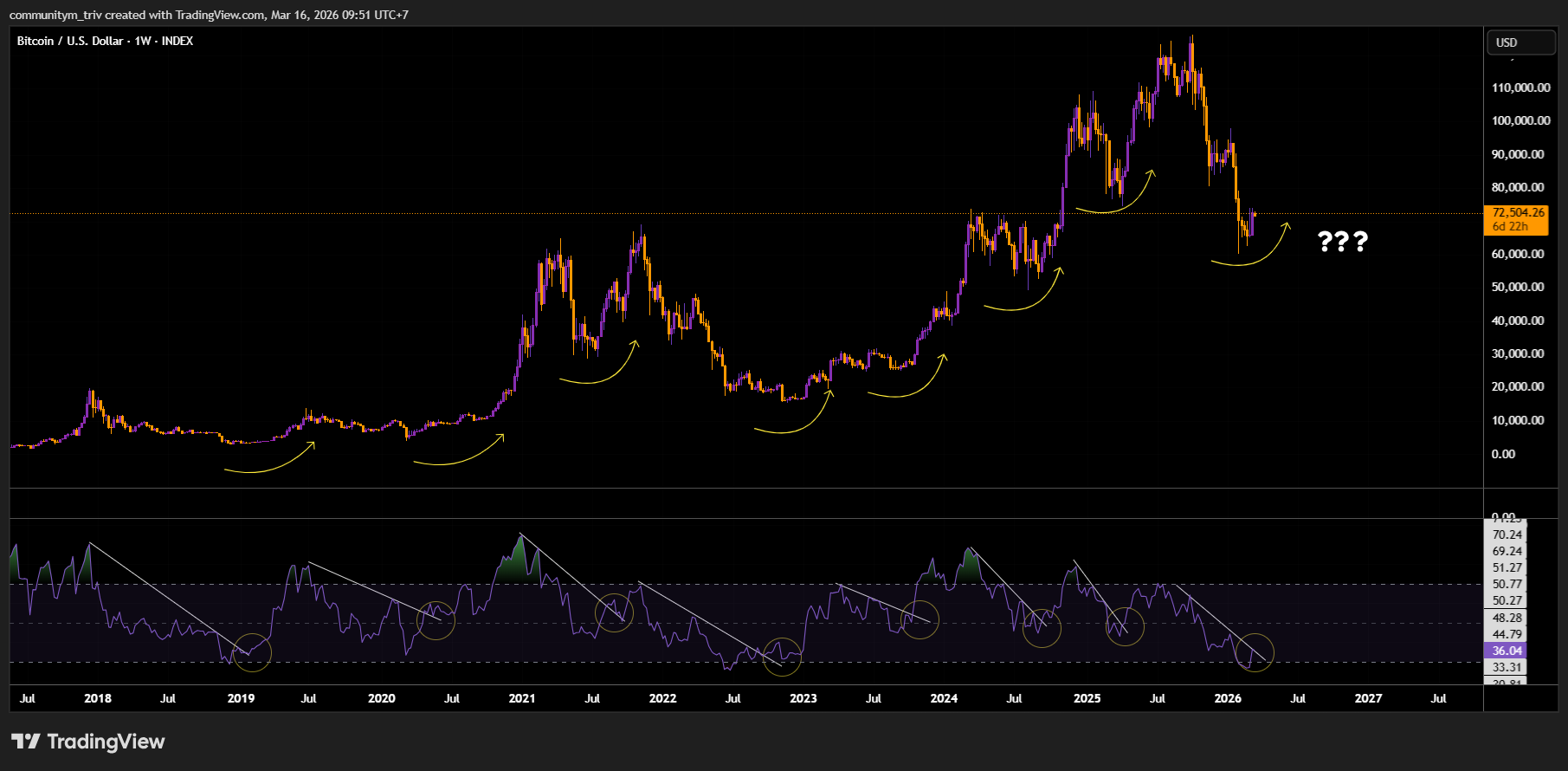 Saat ini RSI kembali mendekati titik breakout setelah melalui periode oversold ekstrem, kondisi yang sangat mirip dengan setup teknikal pada siklus sebelumnya. Dalam banyak kasus, situasi seperti ini sering dianggap sebagai sinyal “buy the dip” jangka panjang oleh investor.