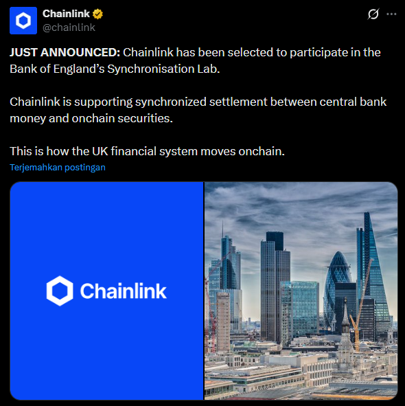 Chainlink resmi diumumkan sebagai salah satu peserta dalam Synchronisation Lab (Synchro Lab) milik Bank of England. Pengumuman ini dibagikan langsung oleh akun resmi chainlink, hal ini menandai langkah besar integrasi teknologi blockchain khususnya oracle dan settlement terdesentralisasi dengan infrastruktur keuangan tradisional Inggris. Berita ini menyoroti kolaborasi dengan tagline yang menekankan pergeseran sistem keuangan UK menuju on-chain. Ini bagian dari ekspansi Chainlink ke ranah institusional, membangun peran utamanya sebagai penyedia oracle untuk data real-world di smart contracts.
