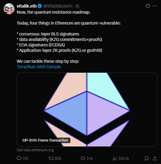 Kabar penting datang dari co-founder Vitalik Buterin. Pada 26 Februari 2026, ia membagikan penjelasan detail mengenai roadmap quantum resistance untuk Ethereum.